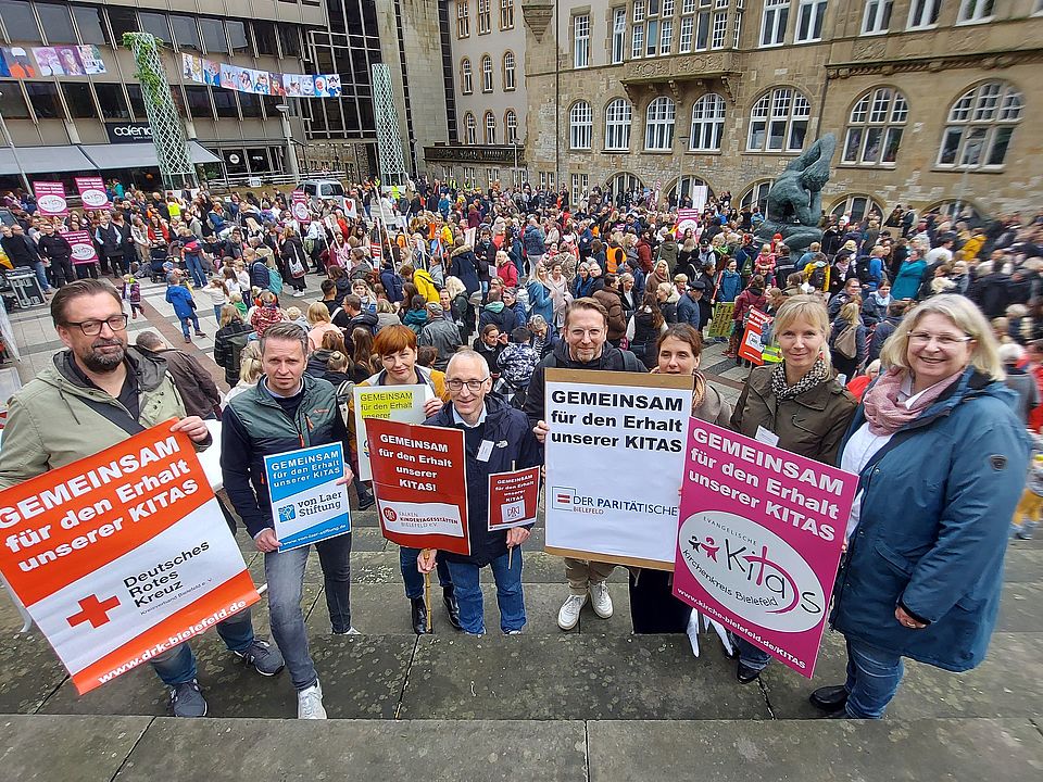 Grund genug für die freien Kita-Träger in Bielefeld, zu einer gemeinsamen Kundgebung unter dem Motto „Gemeinsam für den Erhalt unserer Kitas“ auf den Rathausvorplatz einzuladen. Die Startzeit war symbolträchtig: Fünf vor 12. Rund 3.000 Teilnehmende, unter ihnen Kita-Mitarbeitende, Eltern und Kinder aus Bielefeld und den umliegenden Städten und Gemeinden, waren gekommen, um sich für eine auskömmliche Finanzierung und bessere Arbeitsbedingungen einzusetzen. Zeitgleich fanden weitere Kundgebungen statt, die größten von ihnen vor dem Landtag in Düsseldorf, in Solingen, Hamm und Siegburg.
